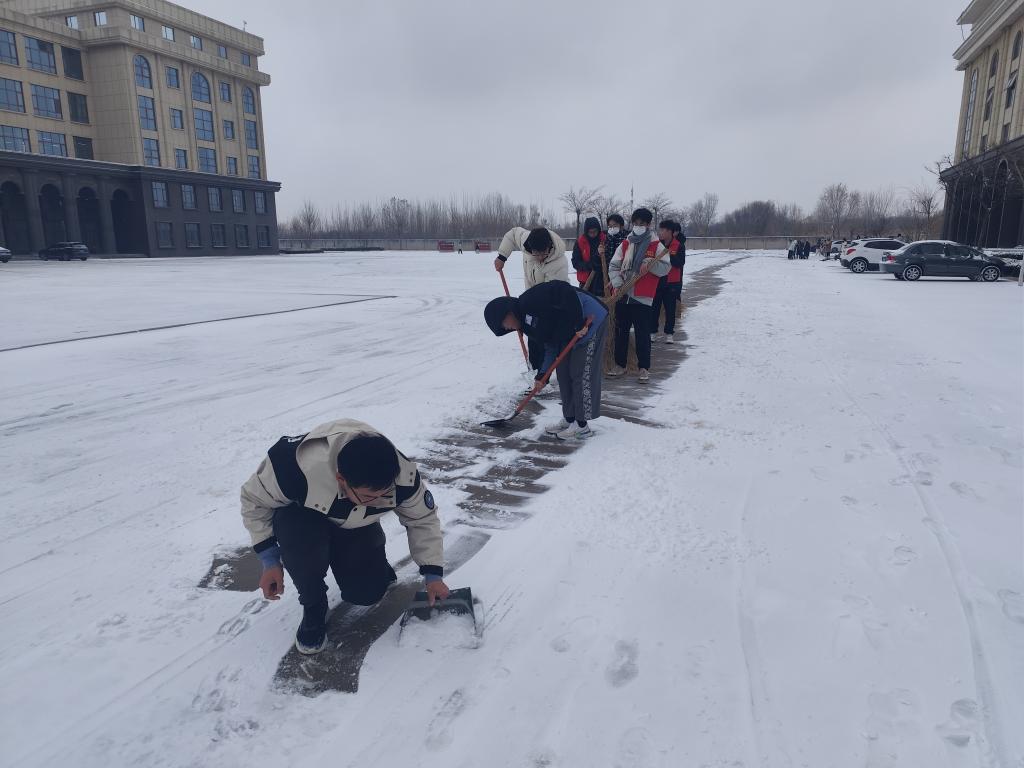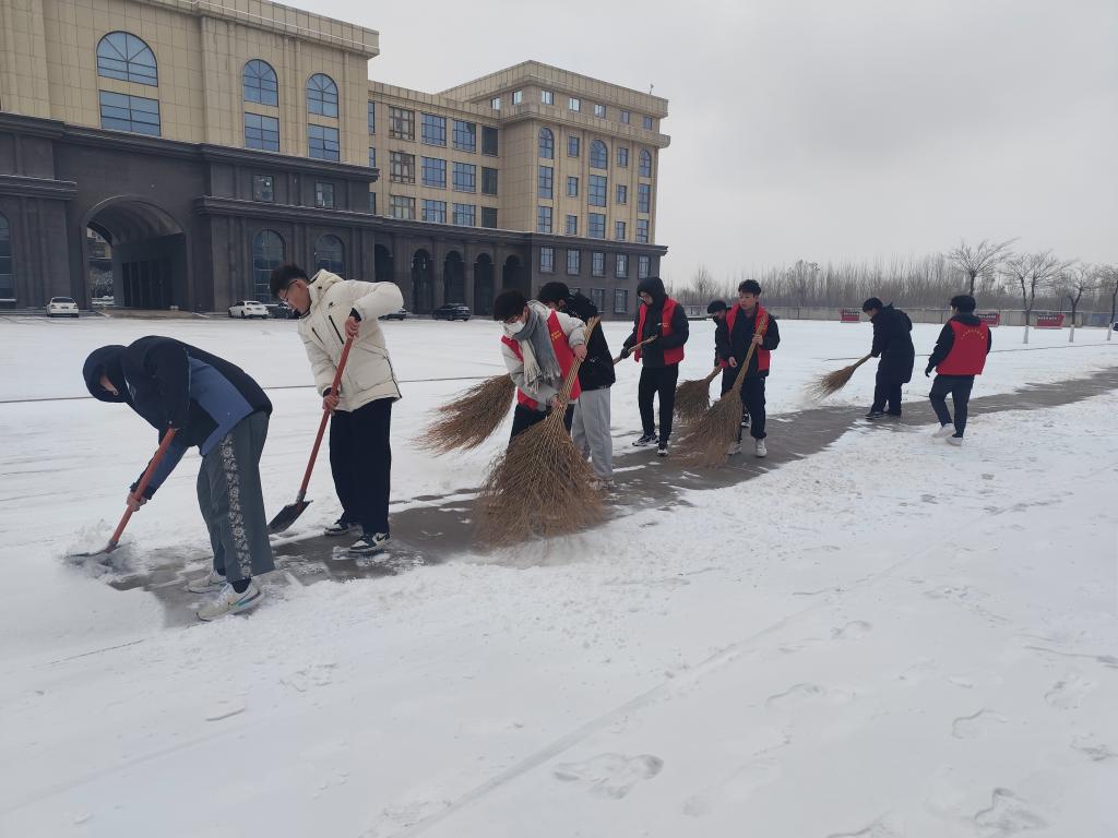 瑞雪兆丰年,今天鲁北大地迎来了入冬以来第一场大雪。12月11日清晨,大地已经银装素裹,皑皑白雪铺满了校园,装扮出了一处处的新奇雪景,但也给大家出行带来些不便。文学与新闻传播学院学生党员、入党积极分子和学生会同学,一个个喜气洋洋,干劲十足地纷纷投入到扫雪行列中来,在博文楼前后左右,男生用铁锨把雪铲松动,女同学用扫帚清出道路……,很快一条蜿蜒的雪中安全小径呈现在大家面前。热火朝天的扫雪结束后,同学们堆起了雪人,打了几下雪仗,深入体会了一下北国雪景的美妙。