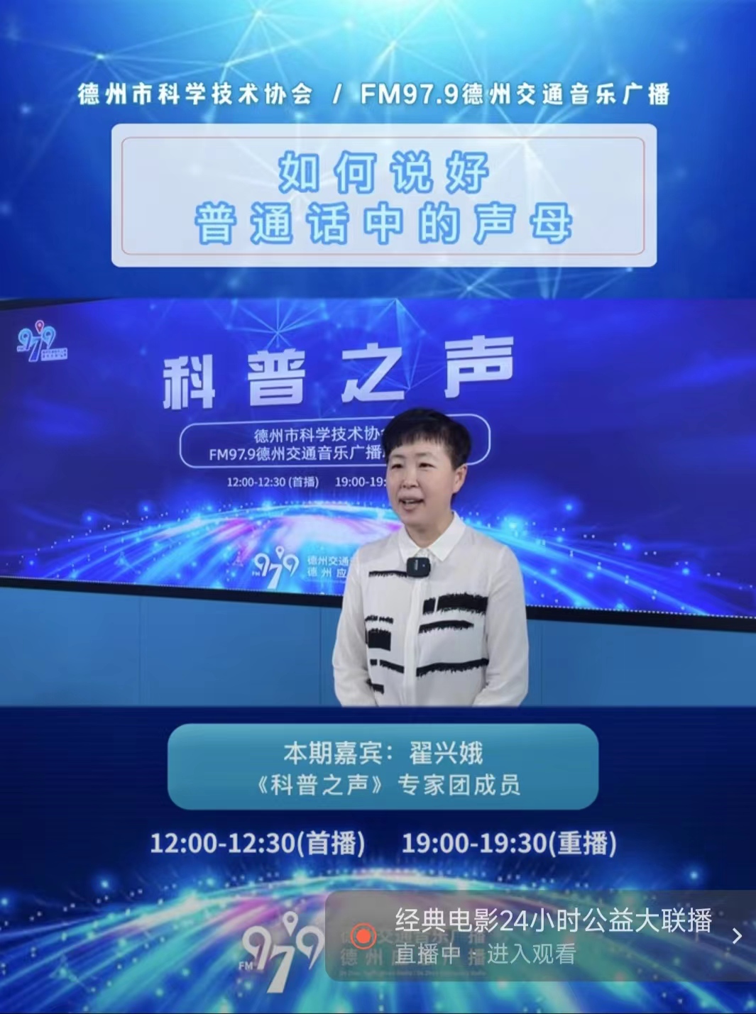 《科普之声》栏目由德州市广播电视台与德州市科学技术协会共同策划,FM97.9交通音乐广播频率制作播出。从今年4月底开始,翟兴娥教授已参加了七期《科普之声》栏目的直播录制。在《德州人如何说好普通话》系列中,翟兴娥教授讲解了如何通过纠正声母、韵母的发声部位,以及明晰声调来讲好普通话的方法。同时在《生活中的三原色》系列节目中讲述了红色、黄色、蓝色三种颜色给人的视觉感受以及背后的文化基因。直播节目播出之后,受到德州交通音乐广播电台领导的一致好评和听众的热烈欢迎。