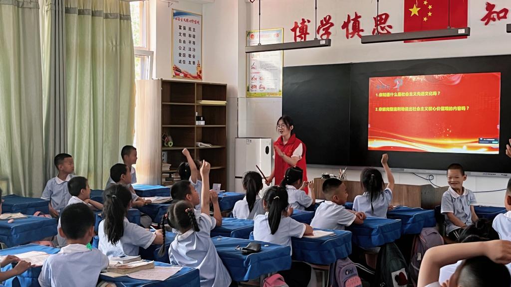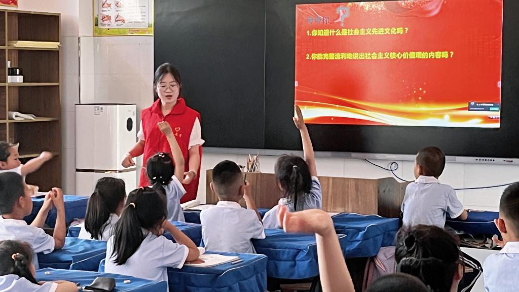 在课堂上,宣讲团成员向学生们讲述了社会主义先进文化和诗文朗诵的相关知识,学生们对此表现出了浓厚的兴趣,不管是他们朗朗的读书声,还是背诵社会主义核心价值观时的胸有成竹,无不表现出他们对社会主义先进文化的熟悉与喜爱。此次活动在《中国少年》的朗诵声中结束了,通过这次活动,不仅让学生们充分地感受到了朗诵的魅力,也从诗歌作品中汲取到了文化养分和精神力量,提升了他们对社会主义先进文化的认识。