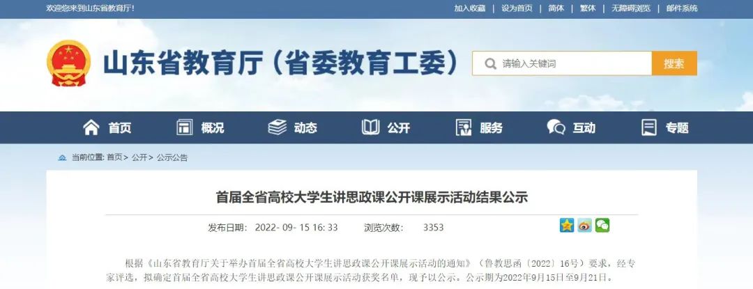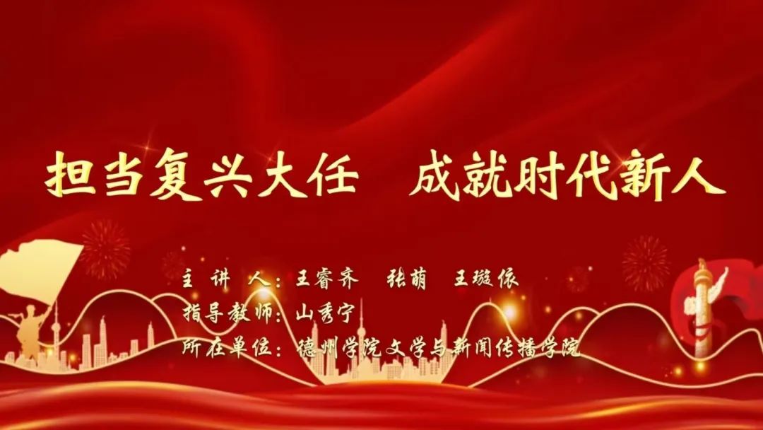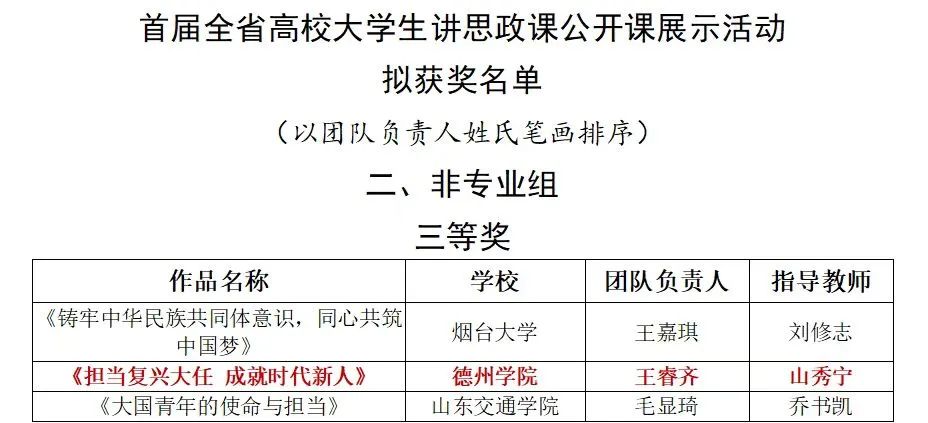 近日,经专家评选和公示,山东省教育厅公布了首届全省高校大学生讲思政课公开课展示活动获奖名单,其中,由山秀宁老师指导,王睿齐、张萌、王璇依同学主讲的作品《担当复兴大任,成就时代新人》荣获非专业组三等奖,并被推荐参加教育部高校思政课教学指导委员会主办的全国高校大学生讲思政课公开课展示活动。