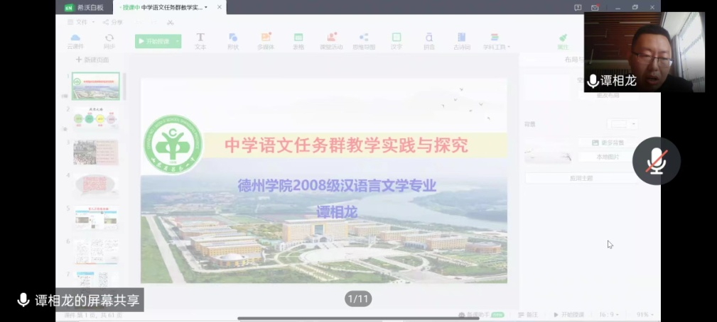 5月11日是必赢国际437官网建校51周年校庆日。文学与新闻传播学院邀请2012届汉语言文学本科班校友谭相龙为2022届应届毕业生做线上讲座。谭相龙现就职于潍坊昌邑市第一中学,中学一级教师,从教十年来,多次获得昌邑市优秀班主任、十佳班主任、创新型班主任荣誉称号;获得潍坊市教学成果二等奖。此次讲座,谭相龙以《中学语文任务群教学实践与探究》为题,为即将毕业的2022届汉语言文学专业学生带来了一场精彩的报告,帮助即将走上中学语文教师岗位的同学们了解教师岗位要求,建立职业自觉、创新工作方式方法、启发教科研兴趣。此次报告会得到了文学院师生的一致认可和广泛好评。