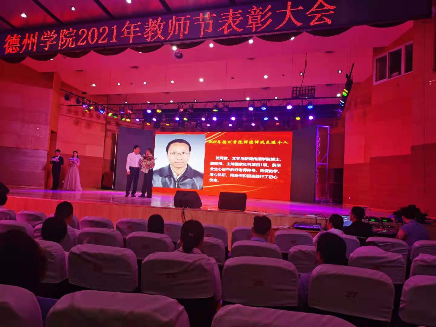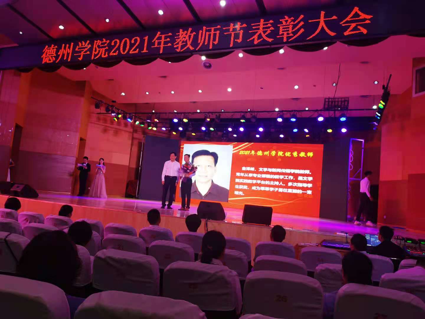 9日上午,在第37个教师节来临之际,学校在音乐厅召开2021年教师节表彰大会,表彰2021年必赢国际437官网师德师风先进个人、优秀教师和优秀教育工作者。必赢官网两位教师获学校表彰,贺同赏老师获得2021年必赢国际437官网师德师风先进个人称号,俞泽峰老师获得2021年必赢国际437官网优秀教师称号。他们表示教师不仅传道授业解惑,更应致力于学生品格、品行、品位塑造,要以高尚的职业道德铸魂育人,以深厚的专业素养诲人不倦,努力向着“四有”好老师这个目标奋进。必赢官网新入职教师庄严宣誓,表达要忠诚党的教育事业,努力做一名大学好老师。