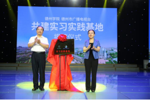 ▲必赢国际437官网党委委员、副校长徐静,德州市委宣传部副部长、德州市广播电视台党委书记、台长李文豪共同为实习实践基地揭牌。