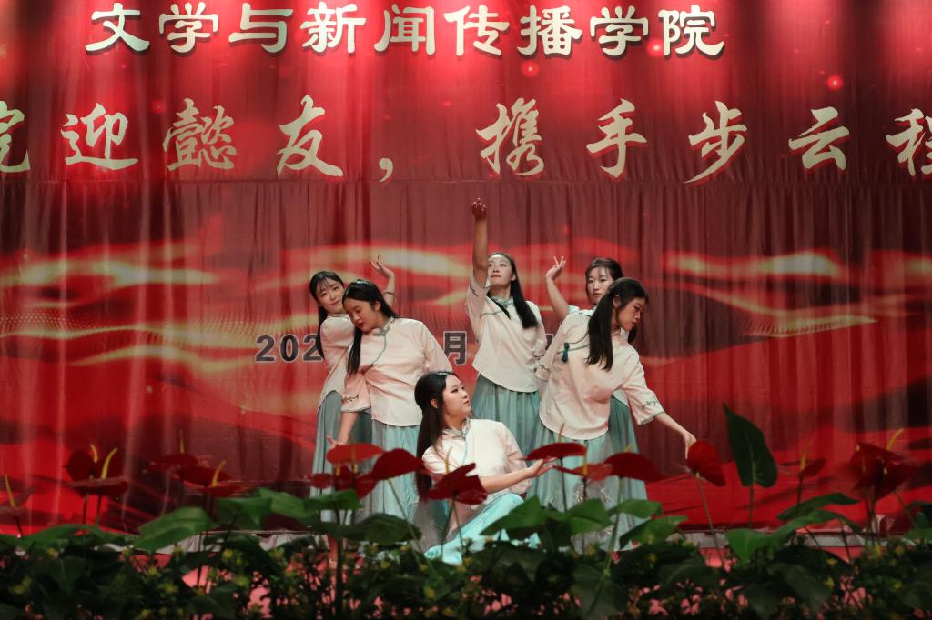 本场晚会精彩纷呈,历经数月的精心准备,为全体观众带来了一场视听盛宴。迎新晚会以古典舞《冯虚御风》拉开了帷幕,向全院师生展现了文院学子“髣髴兮若轻云之蔽月,飘飖兮若流风之回雪”的最美风姿。动感十足的舞蹈《恋爱循环》《Uh-Oh》,活力四射,充满了青春校园的气息和热情洋溢的青春魅力;一首首动听的歌曲《天黑黑》《日不落》《爱的回归线》等充满了艺术感与浪漫感,令人热血沸腾。精彩绝伦的配音秀、话剧《觉醒的中国》和诗朗诵《读中国》,表达了文学与新闻传播学院全体同学生逢盛世,讴歌大美祖国,讴歌新时代的情怀;吟诵《橘颂》展现了新一代中文人好修为常,苏世独立的高洁情操和为传承中华民族文化基因奔走先后的壮志雄心。这无不展现了文学与新闻传播学院全体同学的敏捷才思,集体意识,昂扬风貌,给同学们带来了艺术与美的享受,使文学与新闻传播学院全体新生陶醉其中,使现场的欢呼声与掌声雷动。激情澎湃的大合唱《奔跑》使本场迎新晚会的气氛达到最高潮,最后,在场的领导、老师和演职人员合影留念,为此次晚会画上圆满的句号。文学院师生将以此为契机,携手张起前行的征帆,奔向前行的彼岸,追逐最美的青春梦想。