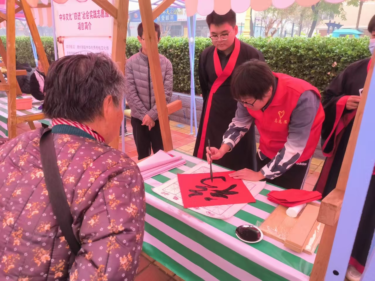 活动伊始,同学们首先为社区居民吟诵了《诗经》中的名篇《卫风·木瓜》:借此向居民传达了珍重情意永相好的美好愿望,“投我以木瓜,报之以琼琚。”高亢嘹亮的嗓音和充满活力的表演成功赢得了社区居民的阵阵掌声,连绵不绝。吟诵表演完毕后,同学们还为社区居民进行了书法展示,同学们凭借精湛的书法技艺在一张张红纸写下一个个“福”字,并免费赠与社区居民,寓意“福荫庇护,心想事成”。此举不仅帮助社区居民进一步感受到了书法文化的博大精深,更烘托渲染出文学院的传统文化氛围和人文关怀,获得了社区居民的一致好评。