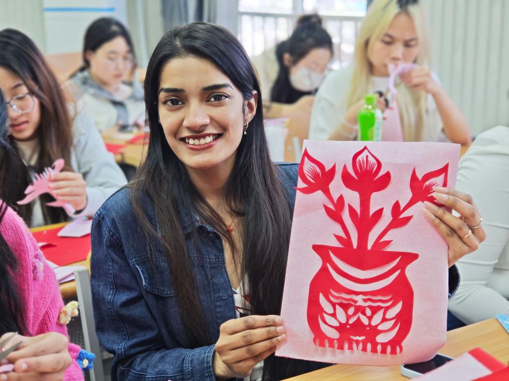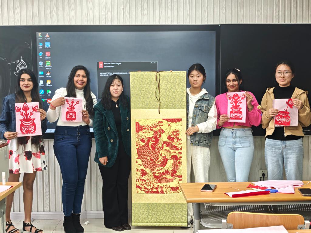 活动中,省级非遗项目朔之乡剪纸传承人石万照现场指导教学。从折纸、构图到下剪,在老师细致地讲解和指导下,同学们逐步掌握了剪纸的基本步骤与技巧。其中,外国留学生们表现得尤为兴奋,她们被剪纸艺术的精妙深深吸引,纷纷拿起剪刀尝试创作,脸上洋溢着好奇与喜悦。随着剪刀的舞动,一幅幅精美的剪纸作品跃然纸上,其中既有寓意团圆美满的花瓶图案,也有灵动绽放的花朵造型。这些作品不仅生动展现了剪纸艺术的独特魅力,更寄托着大家对生活的美好祝愿。同学们互相交流着自己的作品,感叹剪纸艺术的博大精深,脸上洋溢着自豪与满足。