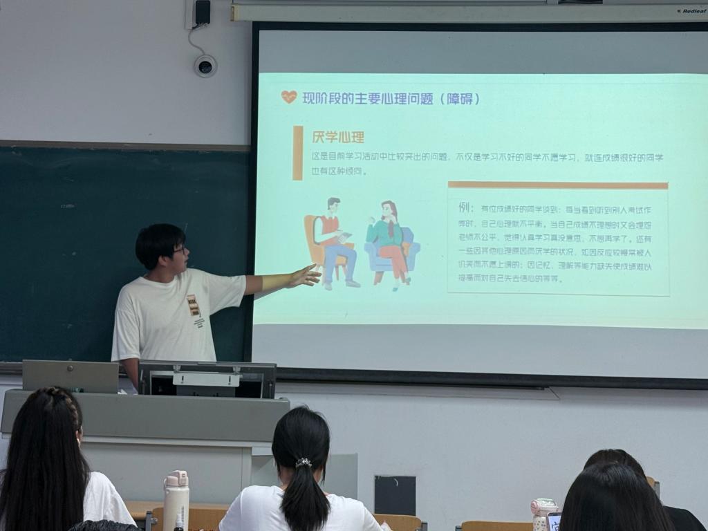 活动现场,主持人通过案例和图文资料,详细讲解了考试焦虑、情绪管理等心理健康知识,深入分析了常见心理问题的产生原因与应对思路。在互动环节中,主持人引导同学们畅所欲言,分享近期在学习和生活中遇到的心理困扰,并结合查阅的专业资料和相关经验,提出了诸如制定合理学习计划、运用呼吸放松法调节情绪等实用策略。此外,活动还设置了小组交流讨论等环节,让同学们在轻松的氛围中互相交流、共同探讨,进一步加深了对心理健康知识的理解与运用,互帮互助迎接即将到来的挑战。