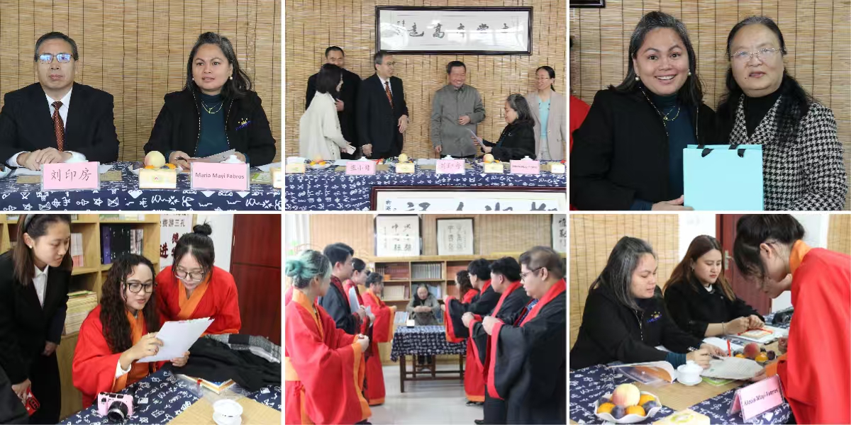 学校党委委员、副校长刘印房,必赢国际437官网党委书记仲冲,副书记、副院长黄传波,副书记鞠晶晶,市外办科员张小玮一行陪同外宾来到博文楼“柳湖吟诵社吟诵工作室”,展现中华礼乐文化。杨华老师、柳湖吟诵社成员现场吟诵作品《木瓜》、《咏鹅》,并教授访华团吟诵经典古诗《咏鹅》,共读中华经典,聆听古诗吟韵,领略传礼仪之美。副校长刘印房与菲律宾驻华使馆三秘兼副领事Maria Mayi Fabros 法麻逸、随员June Cabanilla阿雅等进行了友好交流。