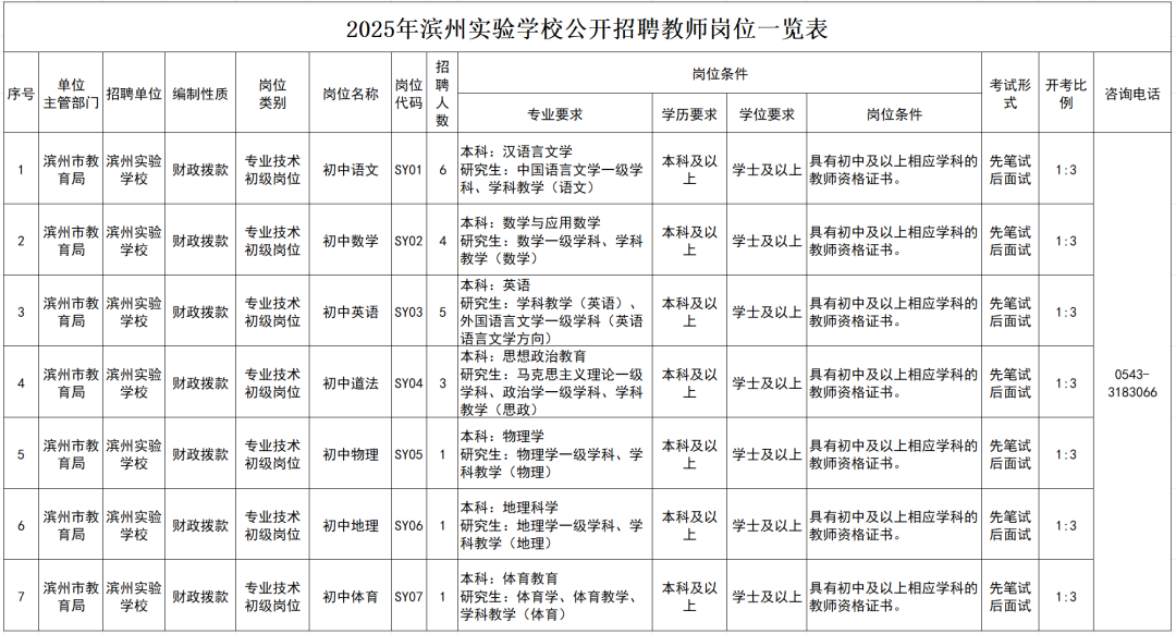 具体招聘岗位、招聘人数及条件要求见《2025年滨州实验学校公开招聘教师岗位一览表》(附件1)。
